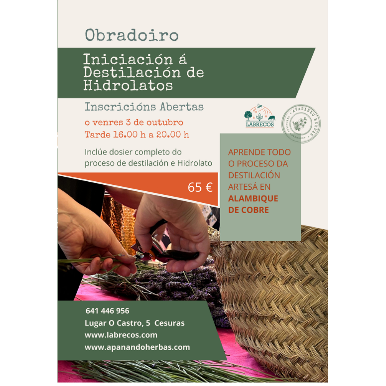 Trabajaremos con un alambique de cobre, explorando las técnicas artesanas que permiten obtener hidrolatos de alta calidad. Será un curso práctico, con explicación teórica y también con una destilación en directo, para que puedas vivir el proceso completo de principio a fin.